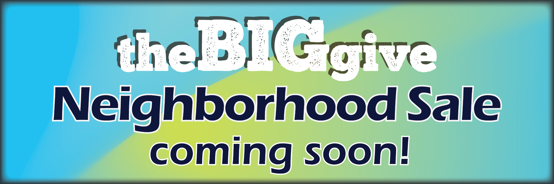 Our annual garage sale, theBIGgive, will be held June 4-6, 2026. We will run from 8am-6pm on Thurs & Fri. On Sat, it will be 8am-noon. Check back soon for more info to come!